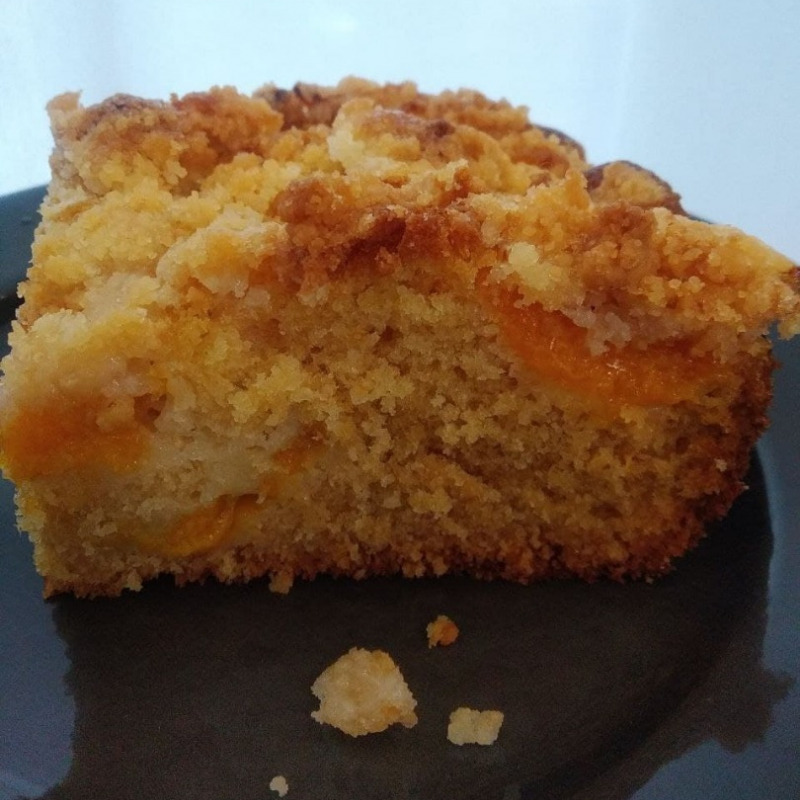 Форму для бакла смазать сливочным маслом. На дно формы налить тесто. Выложить абрикосы плотным слоем, немного утопив их в тесто. Присыпать штрейзельной крошкой. Запекать в духовке в течение 50-60 минут.