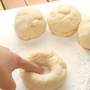 Затем аккуратно растянуть дырки в шариках, чтобы они приняли форму бубликов. Оставить их расстояться еще на 1,5-2 часа.