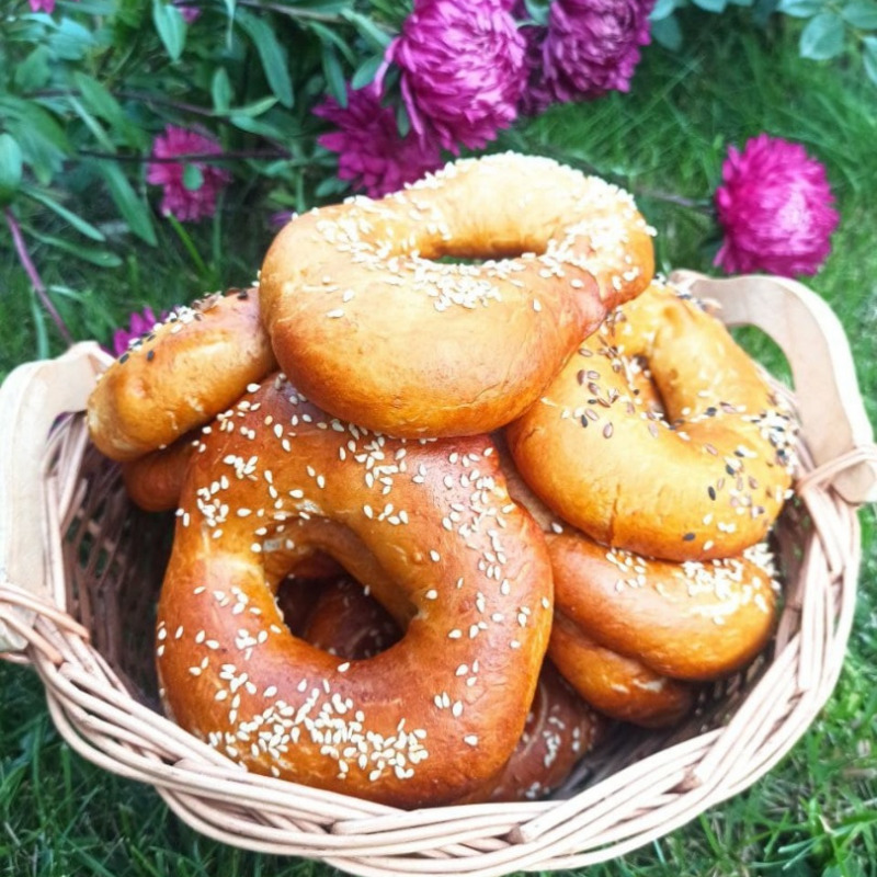 Каждый бублик еще слегка растянуть и подправить его форму руками, затем опустить в кипяток. Дать ему обвариться 5-10 секунд. Достать шумовкой и переложить на решетку, чтобы стекла лишняя жидкость. Посыпать бублики маком, кунжутом или семенами. Переложить бублики посыпкой вверх на застеленный пергаментом противень и выпекать 10–15 минут. Каждый бублик должен зазолотиться, но ни в коем случае не подгореть. Дать бубликам полностью остыть.
