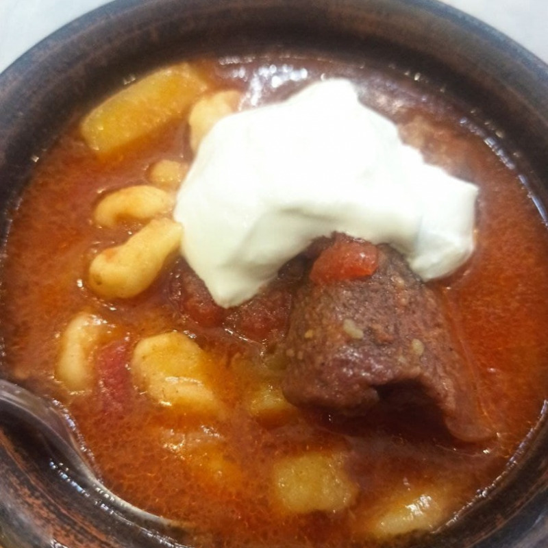 Когда мясо размягчится, добавить очищенный и нарезанный картофель, добавить воды и дать еще повариться на медленном огне. Примерно еще через 30 минут добавить томаты в собственном соку. Добавить сахар. Дать закипеть. Теперь самое время добавить подготовленное макаронное тесто.