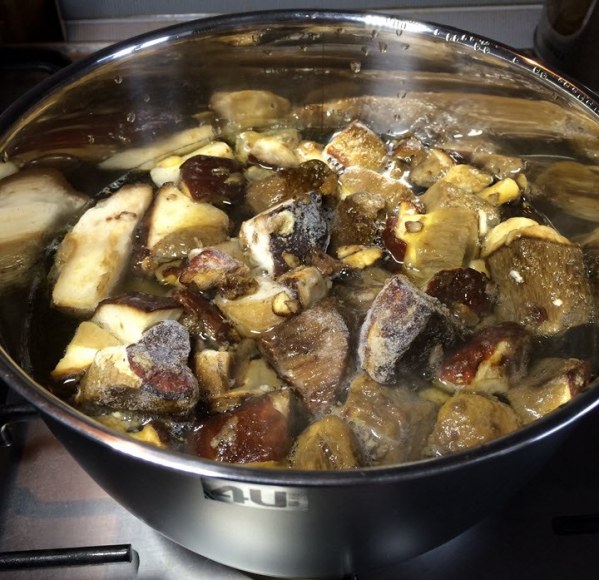 Чеснок мелко порезать, обжарить. Сразу взять кастрюлю с толстым дном, в которой можно обжарить продукты, а потом сварить суп. К обжаренному чесноку добавить грибы, продолжить жарить вместе. Часть обжаренных грибов отложить.