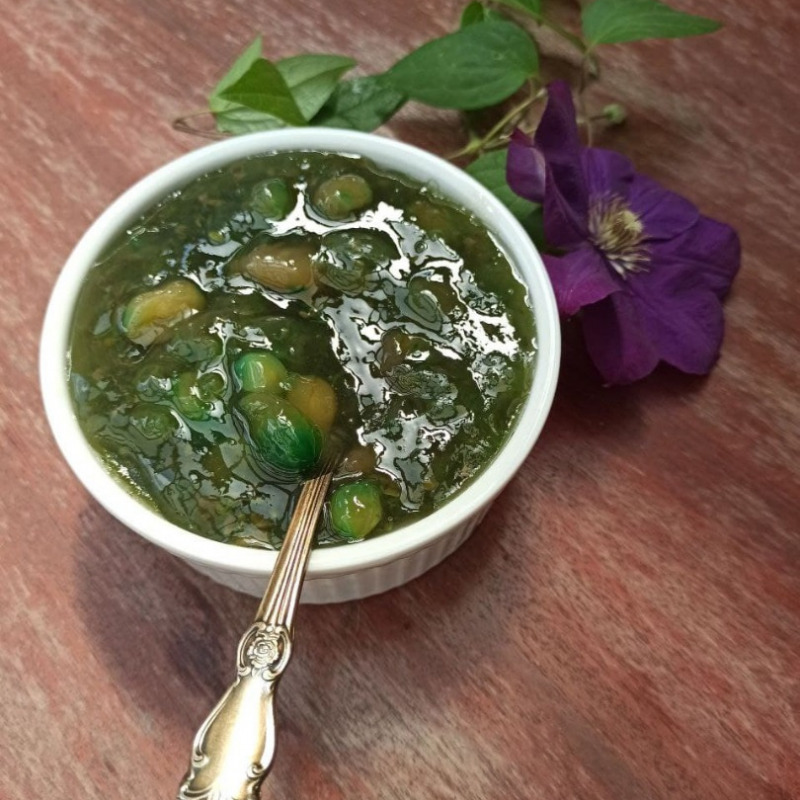 У него очень много названий - царское, изумрудное и другие. Это варенье варится из зеленых ягод. Важно успеть собрать ягоды, когда они уже налились соком, но еще не успели созреть и потемнеть. Сами по себе они довольно кислые, но варенье получается с очень богатым вкусом и очень красивого зелено-золотистого цвета.