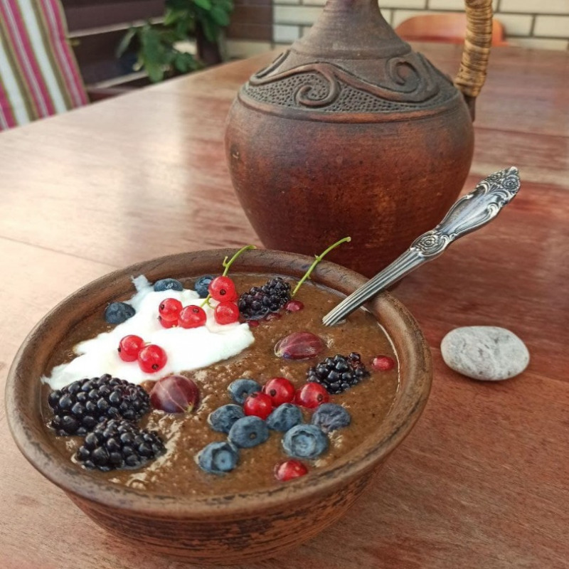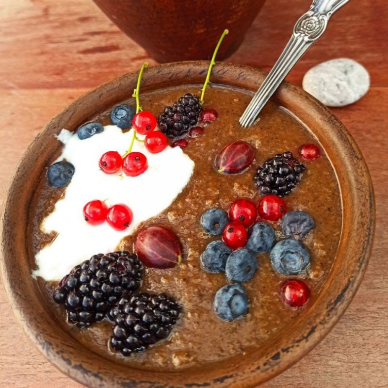 Подавать кашу горячей с йогуртом, обжаренным фундуком и свежими ягодами. Если подавать кашу как десерт, то йогурт можно заменить на взбитые сливки.