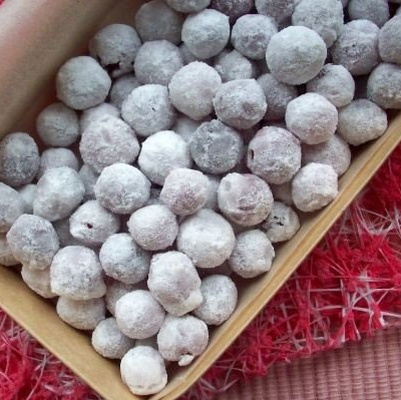 Обвалять клюкву в смеси еще 2 раза. Снова дать обсохнуть. Выкладывать клюкву небольшими порциями в дуршлаг и стряхивать излишки пудры.