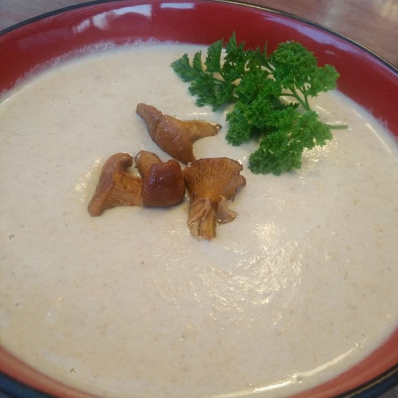 Отложить несколько обжаренных лисичек для украшения в дальнейшем. Влить бульон и варить до готовности картофеля. Пробить суп блендером, добавить сливки. Посолить и поперчить. Дать супу еще раз закипеть. При подаче украсить обжаренными грибами и петрушкой.