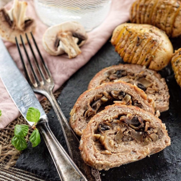 Аккуратно свернуть рулет, помогая себе пленкой. Также осторожно, чтобы не повредить его, завернуть рулет в фольгу. Запекать рулет в предварительно разогретой до 180 градусов духовке в течение 1,5 часов.