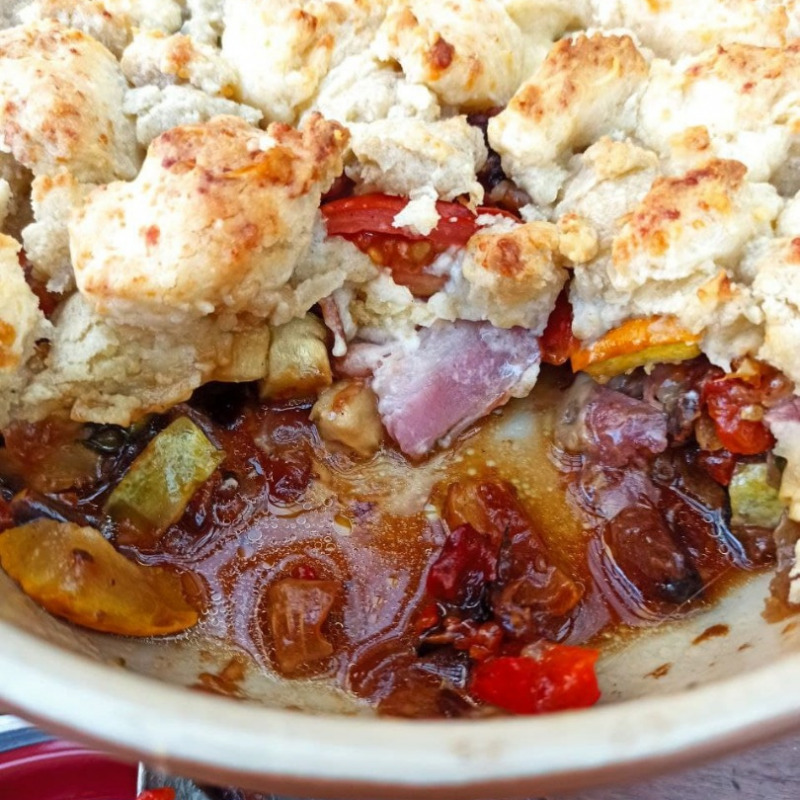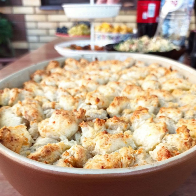 На начинку большой ложкой выложить тесто как бы отдельными кусочками, клецками на некотором расстоянии друг от друга (тесто не должно закрывать всю поверхность). Поставить коблер в духовку примерно на 1 час. Перед подачей слегка остудить.