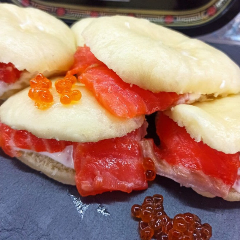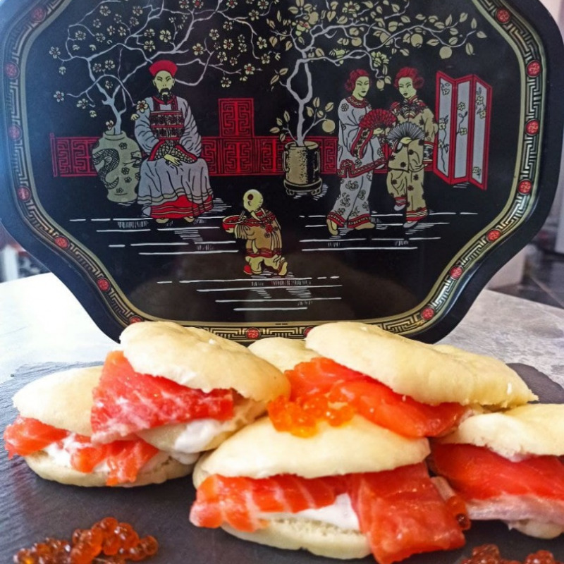 Для соуса смешать сметану с лимонным соком по вкусу и икрой, приправить солью и перцем. Теплые булочки надрезать пополам, промазать икорным соусом, положить по паре ломтиков лосося.