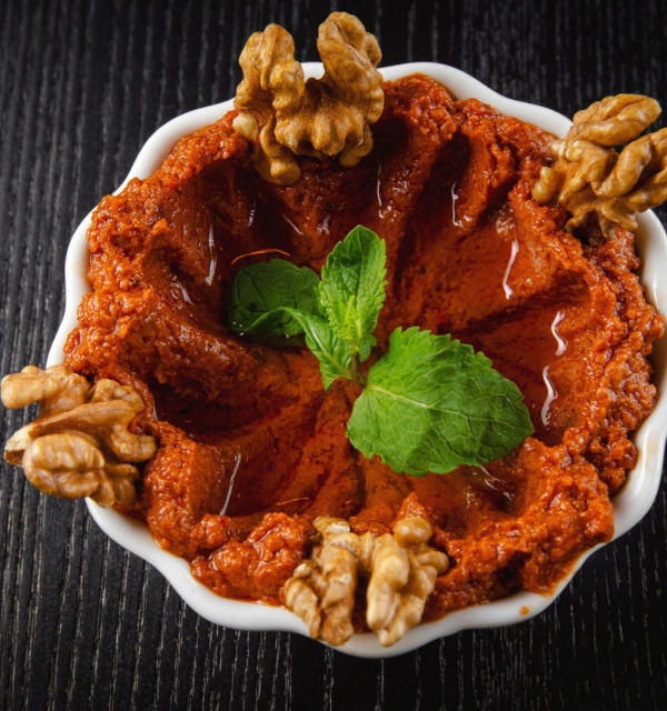 Добавить оливковое масло, специи и все остальные ингредиенты, кроме грецких орехов и гранатовых зерен. Взбить все блендером до состояния пасты. Добавить грецкие орехи и взбить еще раз в импульсном режиме, чтобы оставить частично орехи кусочками.