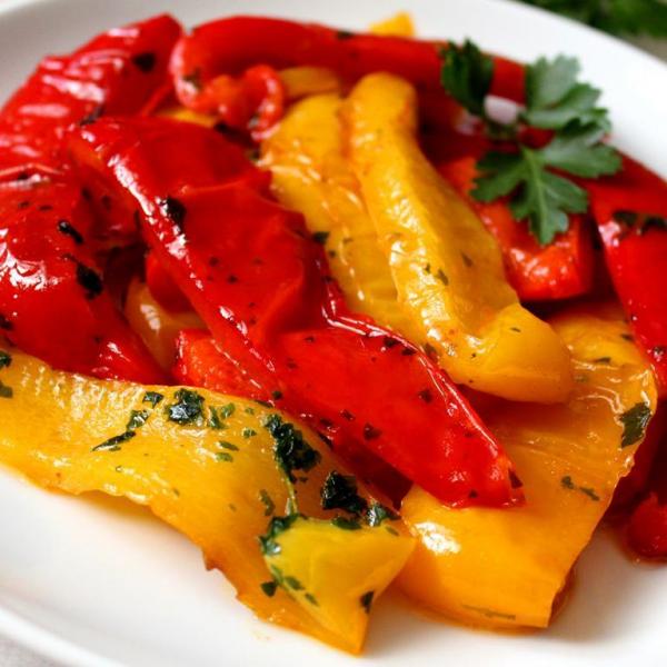 Перцы разрезать пополам, очистить от семян. Сбрызнуть их оливковым маслом и поставить запекаться в разогретую до 220 градусов духовку до черных подпалин. После запекания горячие перцы сложить в пакет, завязать его и оставить до полного остывания. После этого перцы будет легко почистить от кожицы. Очистить их и сложить в миску блендера.