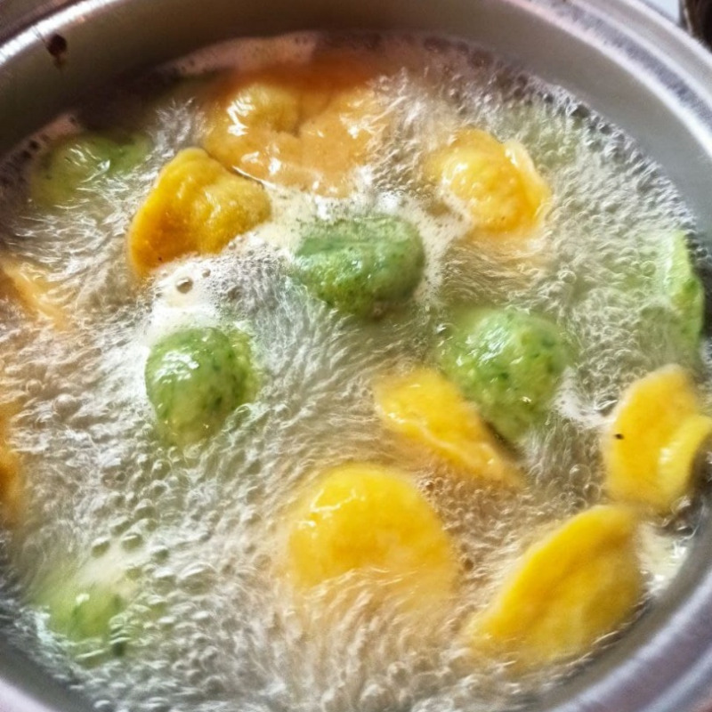 Для теста надо смешать 600 гр муки, 300 мл воды, яйцо и растопленное сливочное масло, соль. Слегка перемешать. Разделить будущее тесто на две части. В одну часть добавить куркуму, в другую измельченный шпинат. Можно взять просто замороженный шпинат, тогда его необходимо разморозить и отжать от лишней влаги. Если шпинат свежий, его надо бланшировать, и также сперва отжать. Замесить два вида теста, желтое и зеленое. Скорее всего в зеленое потребуется добавить еще муки, так как в шпинате все равно будет оставаться много влаги. Тесто не должно липнуть к рукам. Завернуть тесто в пленку и убрать в холодильник на 30-40 минут.