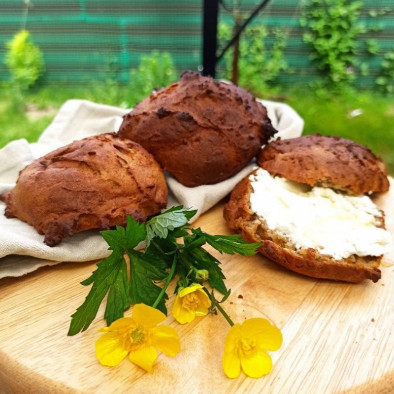 Сначала необходимо смешать все влажные ингредиенты (кефир, масло, творог, мед). Следом добавить оба вида муки, соду и соль. Тщательно вымесить тесто. Тесто получается липким, не стоит переживать из-за этого.