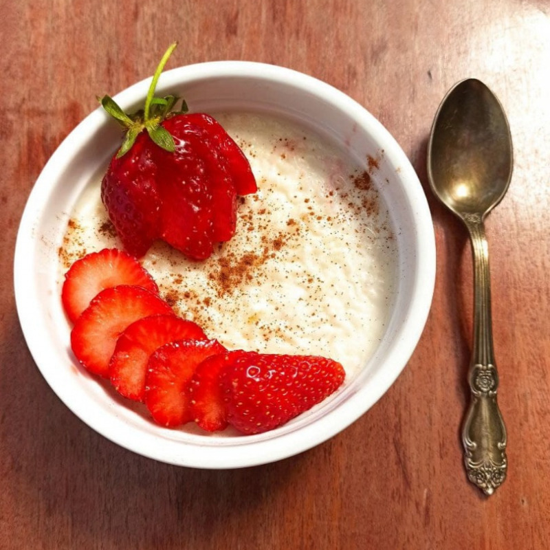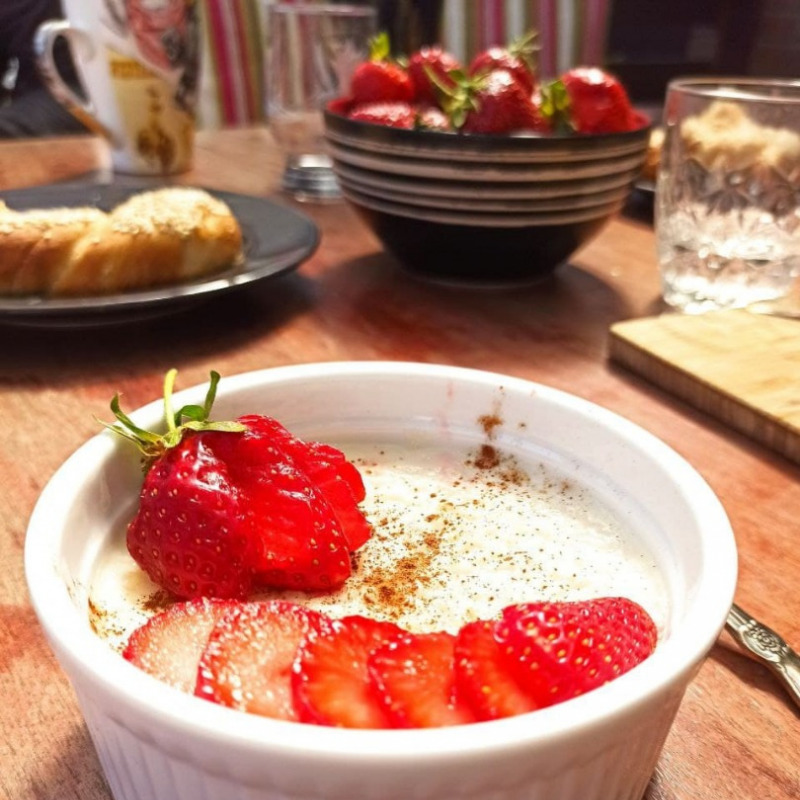 Выложить получившуюся массу в порционные формочки, посыпать корицей. После того как масса остынет, убрать формочки на несколько часов в холодильник (минимум на 4 часа, а лучше на ночь). При подаче украсить клубникой.
