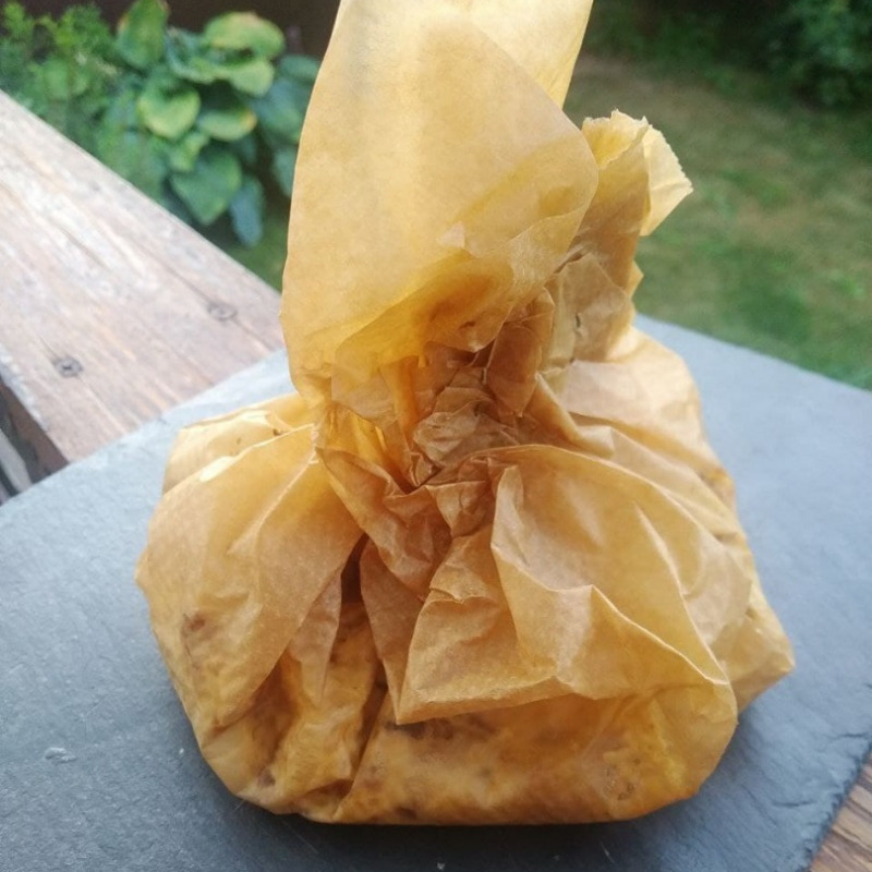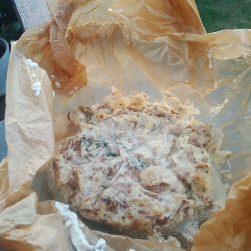 Подготовить 2 куска бумаги для запекания 30х40 см. В центр каждого куска положить филе трески, на него выложить соус с лисичками, украсить веточками тимьяна.