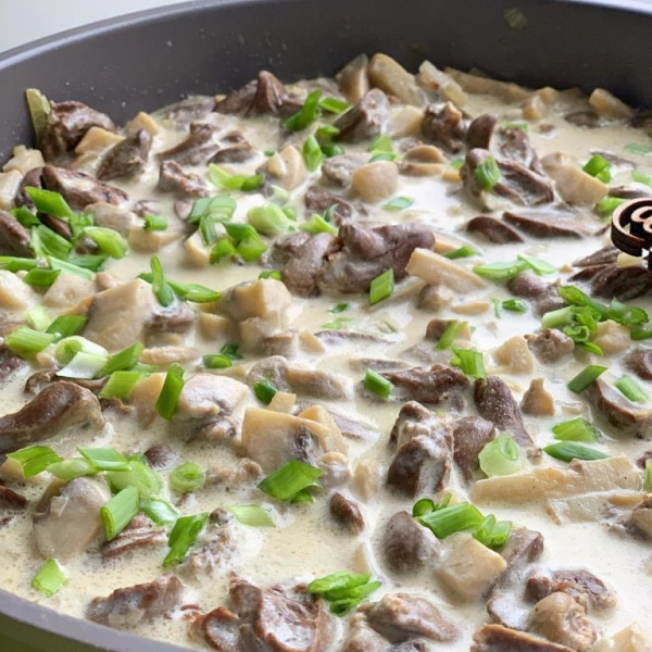 Добавить к луку и чесноку сердечки и желудки. Лучше все это делать в большой и глубокой сковороде. В идеале, потрошки должны обжариваться, а не тушиться Обжаривать в течение 5-7 минут. После добавить размороженные порезанные лесные грибы. Это могут быть и белые, и моховики и другие варианты. Они дадут довольно много жидкости. Обжаривать еще 5-7 минут.