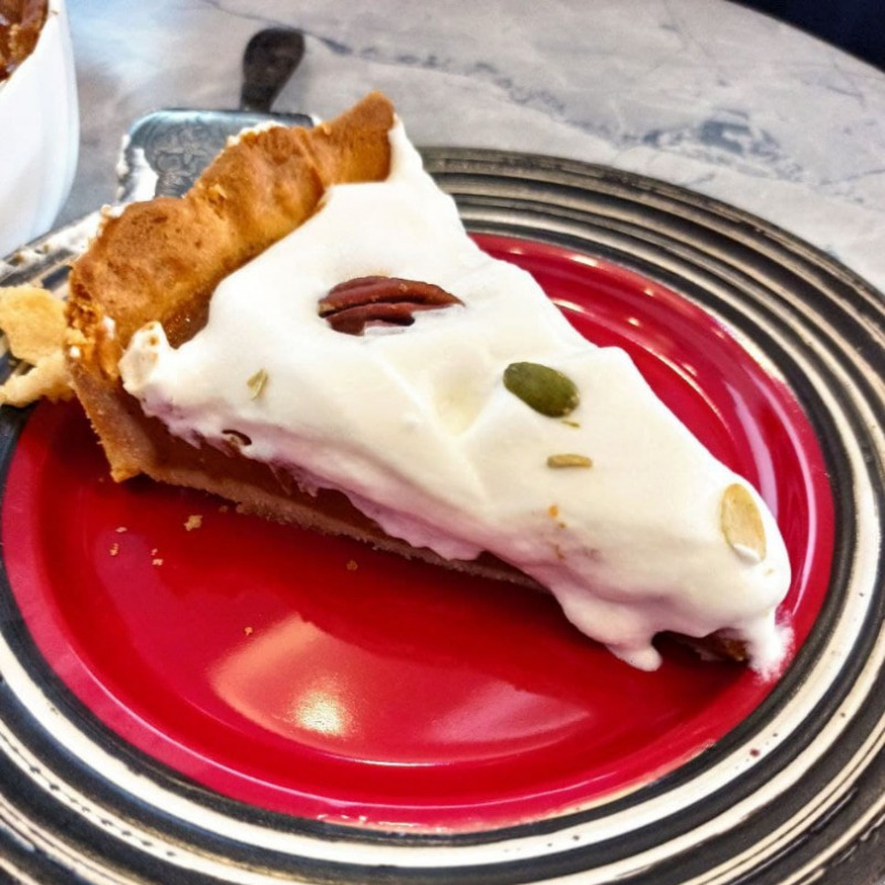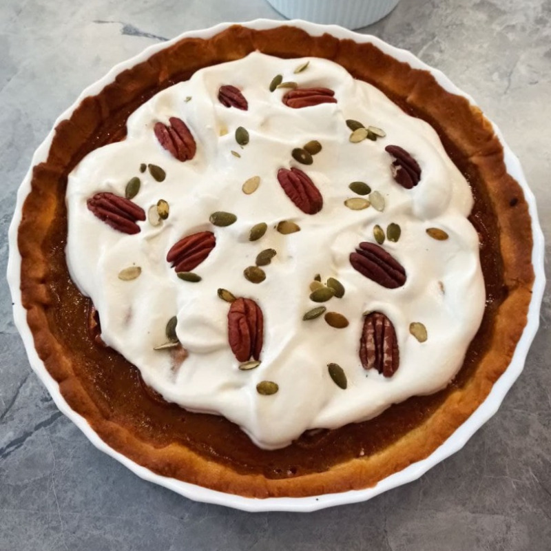 Для украшения пирога взбить оставшиеся сливки, без добавления сахара, украсить верх пирога. Посыпать пеканами и тыквенными семечками.