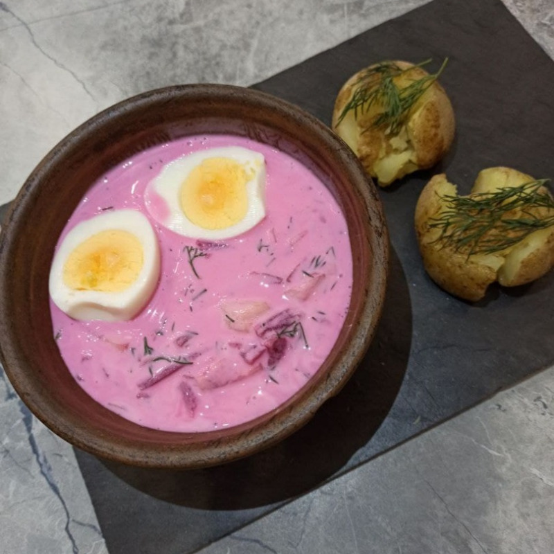 Еще один вариант холодных супов. Он же литовский борщ, он же вариант свекольника. Яркая свекла в сочетании с кефиром дают супу красивый розовый цвет, огурцы добавляют свежесть и аромат, обжигающая запечённая картошка добавляет вкусный акцент.